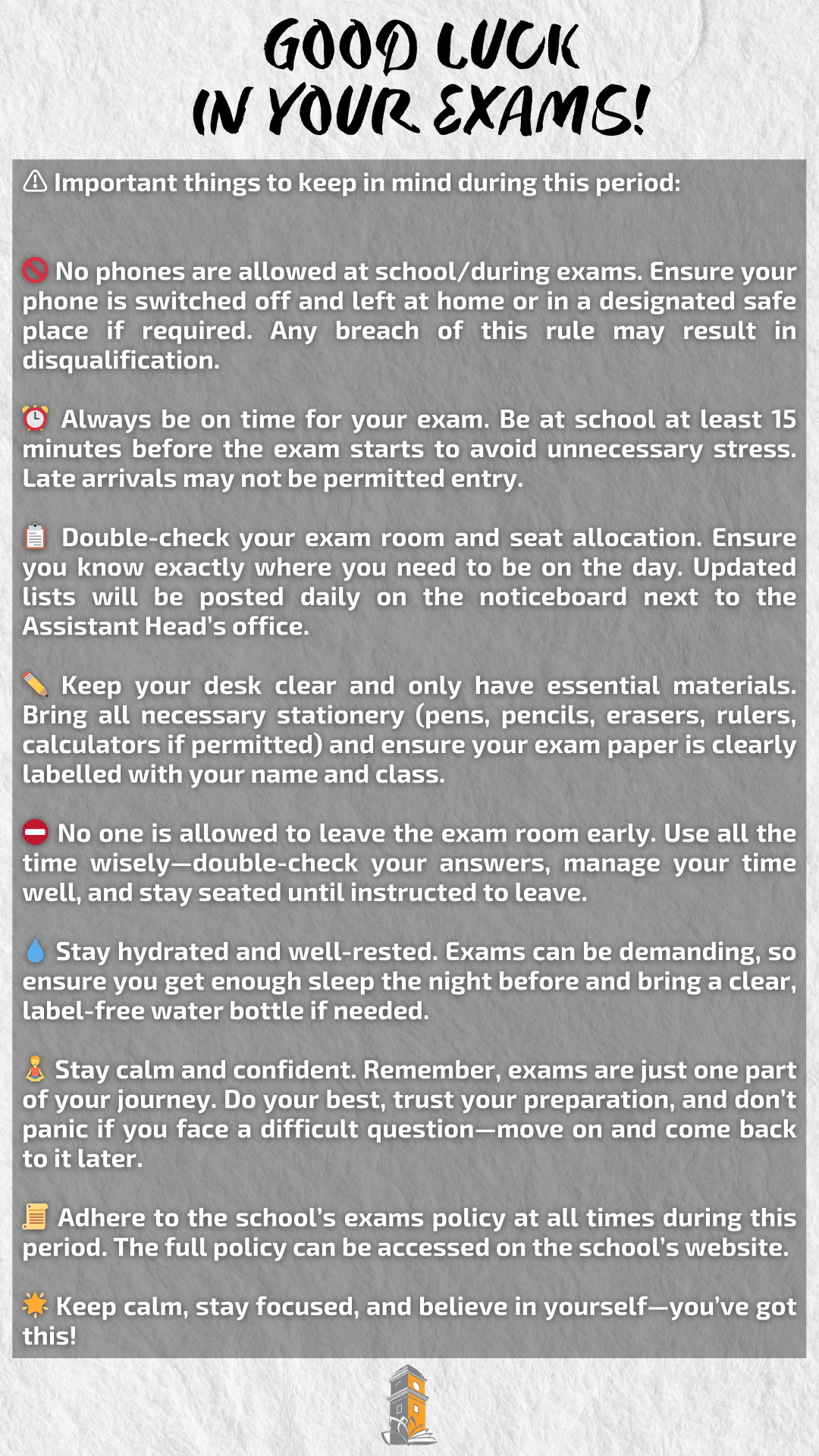 We also kindly remind all students that during exams, everyone is expected to adhere to the school’s exams policy.