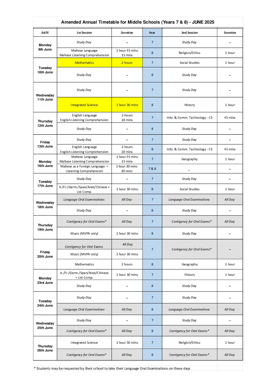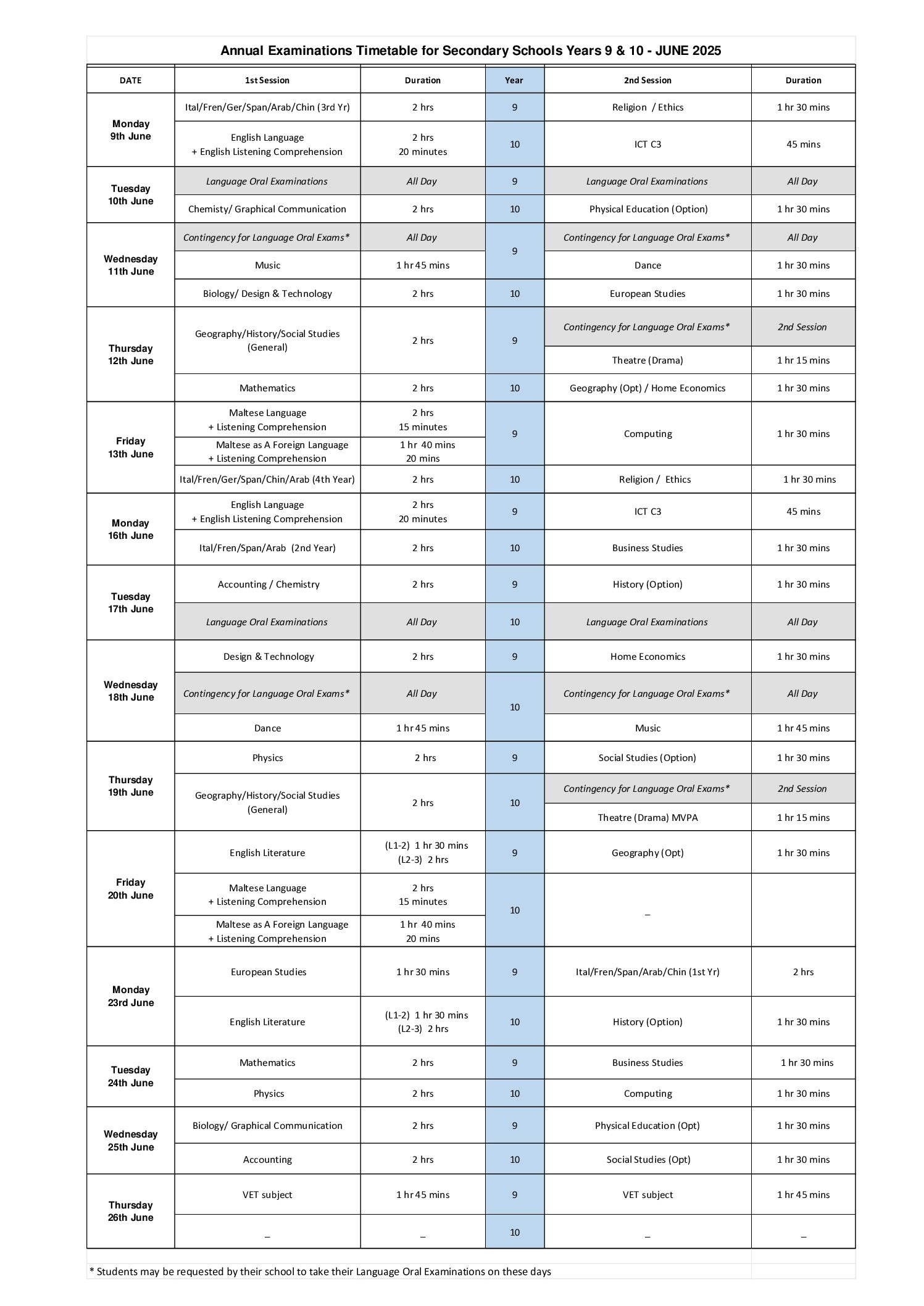 Dear students and parents/guardians, please find underneath the annual exams timetable for 2025.